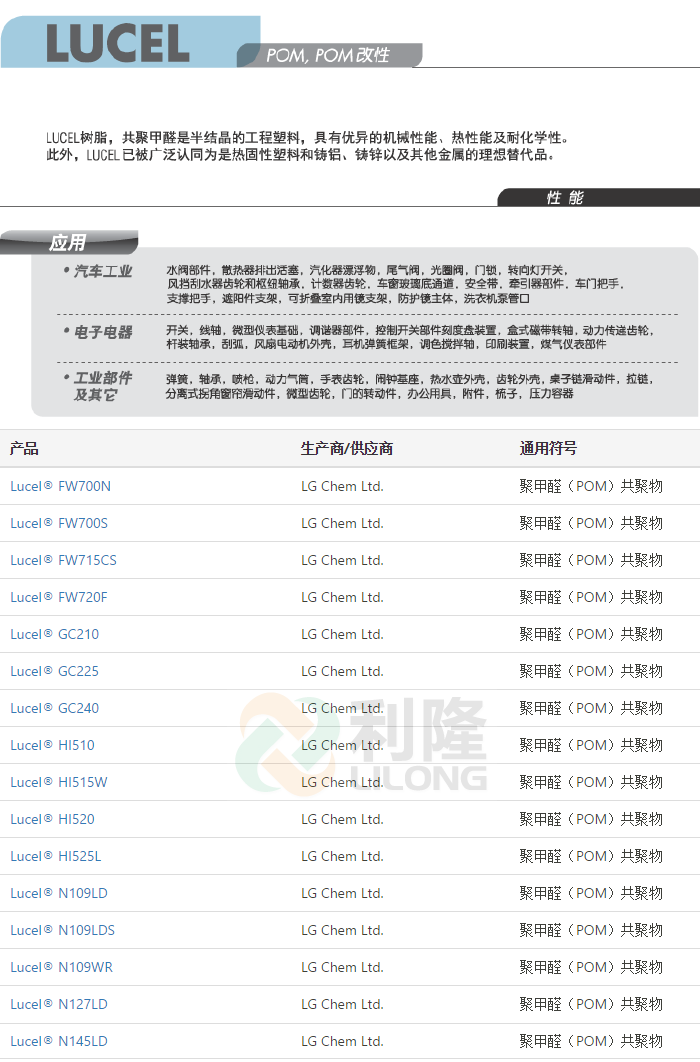 [塑料簡介:]利隆塑料專業經營韓國LGPOM聚甲醛LUCEL品牌塑膠原料,想要了解聚甲醛POM塑膠原料,韓國LGPOM價格,POM性能用途,POM型號和POM物性的客戶,歡迎來電來函咨詢